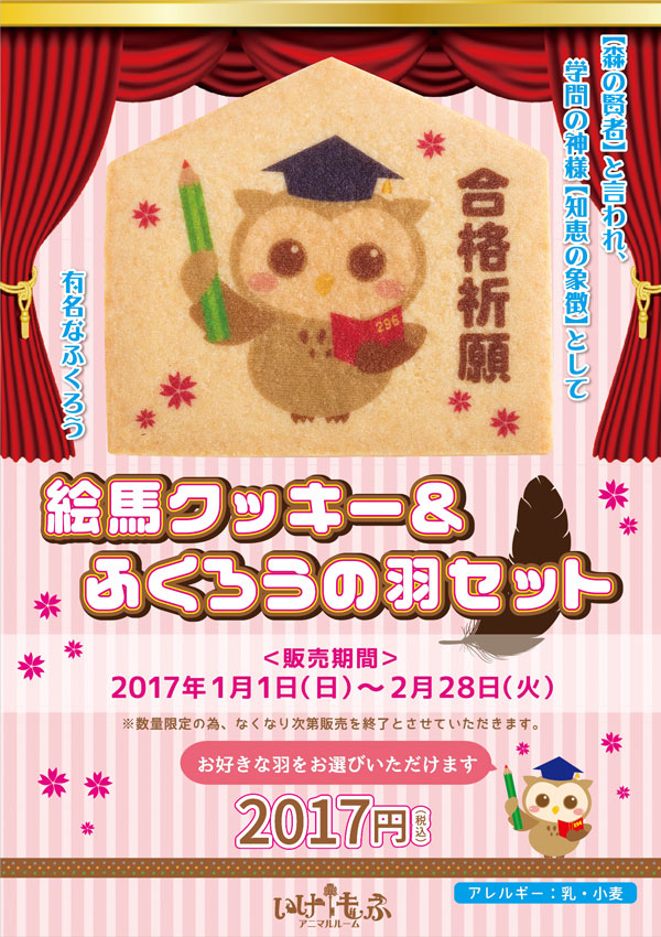 2017年1月1日より、店内にて絵馬クッキー&ふくろうの羽セットを販売いたします。